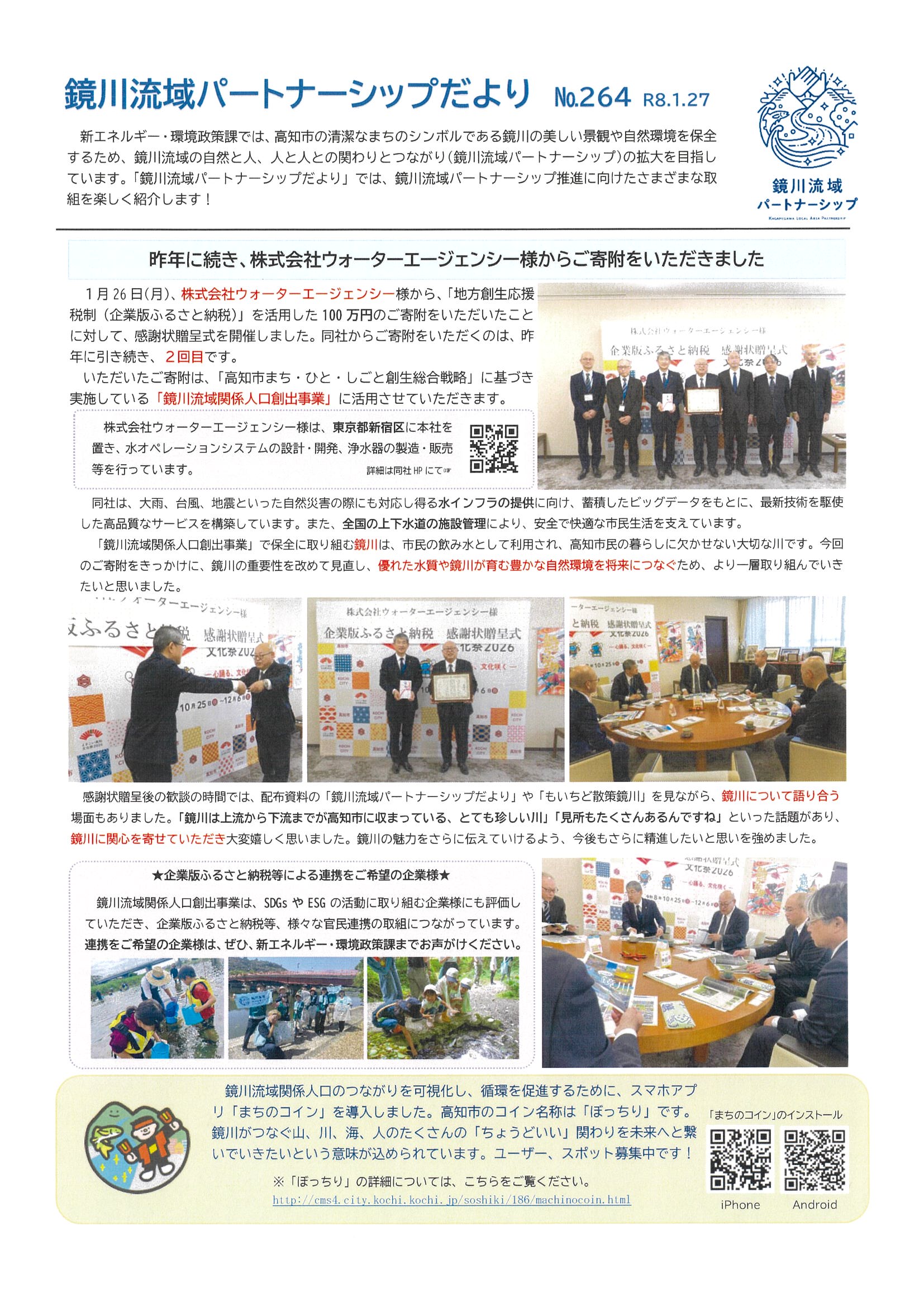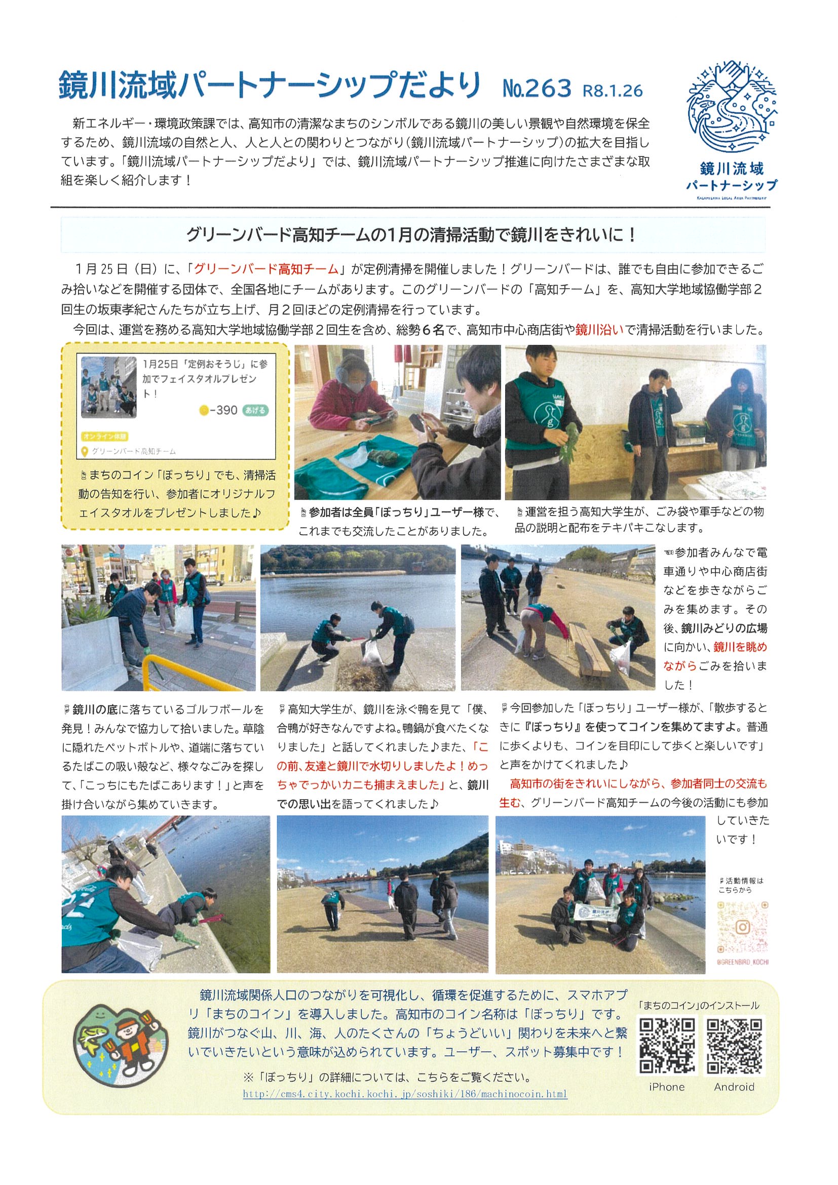 高知市新エネルギー・環境政策課の鏡川流域パートナーシップ推進に向けたさまざまな取り組みを紹介するお便り№263~№265をご紹介いたします。